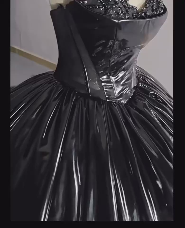 • A glossy black ball skirt that reflects light with every move, like liquid obsidian